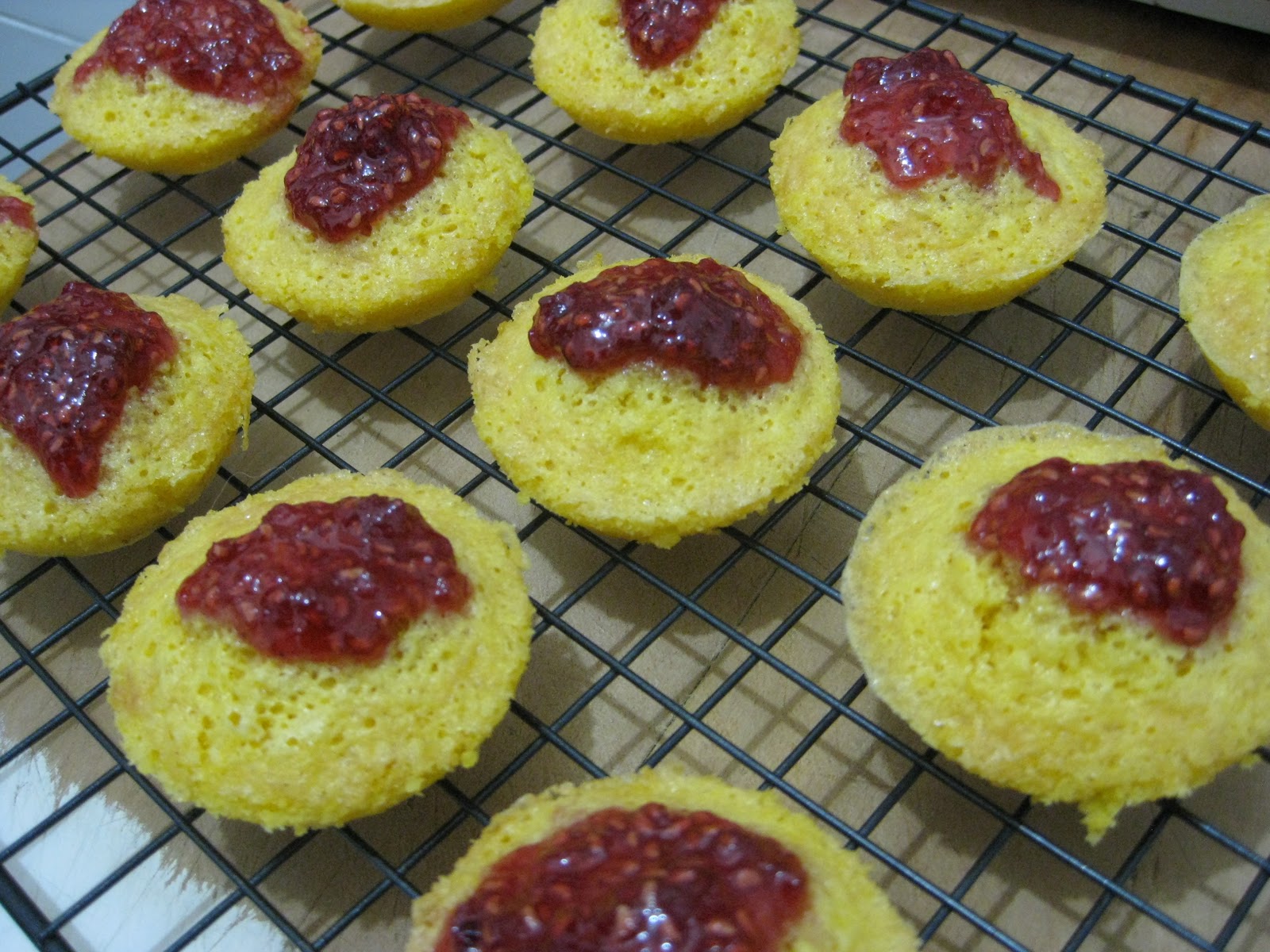 This mixture was to be spooned into greased patty tins. I used my usual canola spray to grease the tins - having finally learnt that it's not a good idea to spray tins in the direction of the stovetop (overspray on the elements. I always do this) I turned away from the oven to spray the patty tins. A few moments later I stepped back towards the bench and almost fell over: this time the overspray had settled on the kitchen floor. Even after I'd wiped it up, I still had a nice greasy coating all over the bottom of my sneaker.Still, I managed to keep my feet long enough to fill the patty tins and get them in the oven. These went into the oven for 10 minutes, after which I took them out again, added a blob of jam to the top of each, and put them back in for another few minutes.